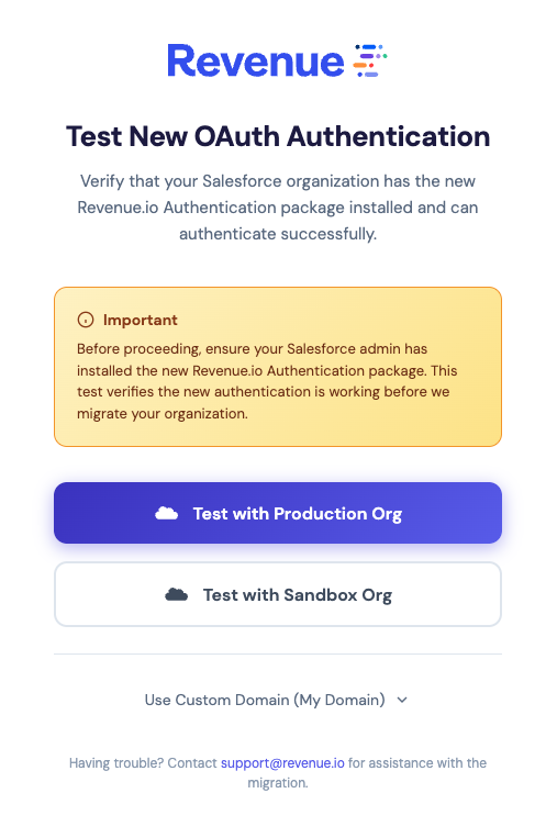 - Click Test with Production or Sandbox Org. If you use a custom Salesforce domain, choose Use Custom Domain.